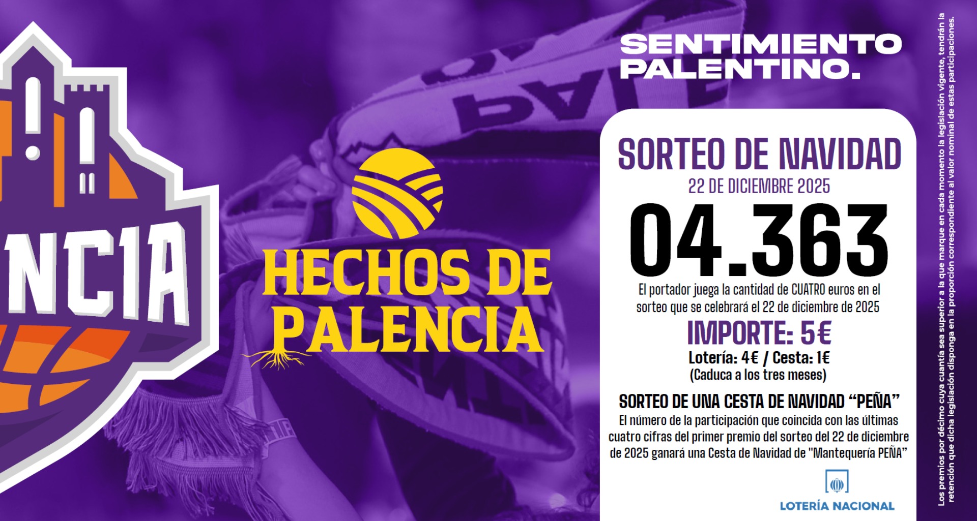 Además, el número de la participación que coincida con las últimas cuatro cifras del primer premio del citado sorteo del 22 de diciembre, ganará una Cesta de Navidad de Mantequería Peña.